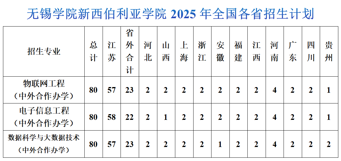 无锡学院新西伯利亚学院2025年全国各省招生计划